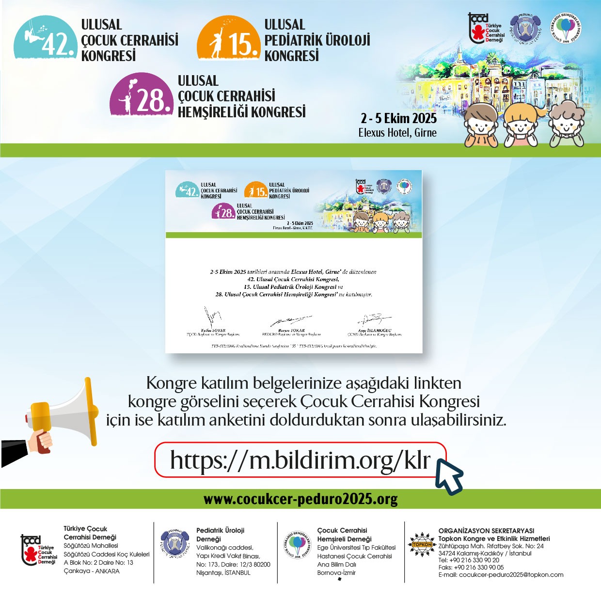 Sizleri 2-5 Ekim 2025 tarihleri arasında Elexus Hotel, Girne’de düzenleyeceğimiz, 42. Ulusal Çocuk Cerrahisi Kongresi, 15. Ulusal Pediatrik Üroloji Kongresi ve 28. Ulusal Çocuk Cerrahisi Hemşireliği Kongresi’ne davet etmekten mutluluk duyuyoruz.